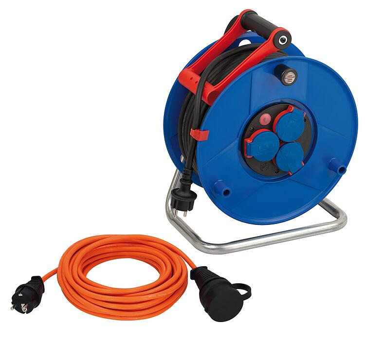 Description Comprend : • 1 x tambour de câble en plastique Garant IP44, longueur de câble = 40 m, d=290 mm - Pour l'utilisation sur les chantiers selon BGI 608 - Type de protection : IP44 - Prises électriques : 3 x Schuko 230 V, 16 A - Câble : H07RN-F 3G1,5 - Qualité du câble : caoutchouc néoprène - Les câbles sont testés selon VDE 0100 partie 704 - Protection contre la surchauffe (Lampes de contrôle) • 1 x Câble de rallonge IP44 10 m AT-N05V3V3-F 3G1,5 orange - Type de protection : IP44 - Câble : Bremaxx AT-N05V3V3-F - Câble robuste jusqu'à -35 °C, résistant à l'huile, aux UV et à l'abrasion - Fiche à contact de protection/accouplement à contact de protection Caractéristiques techniques