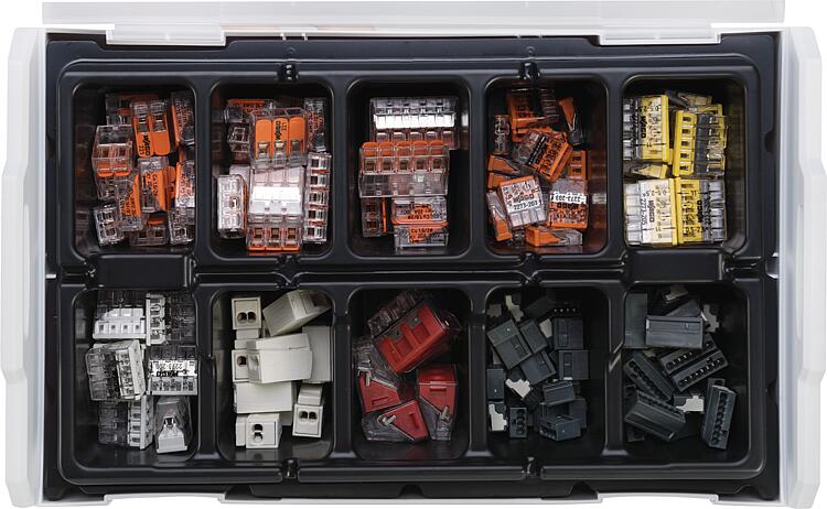 Description • Dimensions extérieures (L x H x P) : 259 x 63 x 155 mm • Poids : 0,61 kg • En Sortimo L-Boxx-Mini®. Équipement : • 1 x câble conducteur H07 V-U 4 mm² de chaque, longueur 150 mm, noir, bleu, vert/jaune • 16 x 2 conducteurs avec levier 0,14-4 mm² Réf. Fabricant : 221-412 • 12 x 3 conducteurs avec levier 0,14-4 mm² Réf. : 221-413 • 8 x 5 conducteurs avec levier 0,14-4 mm² Réf. : 221-415 • 20 x 3 conducteurs enfichables 0,14-2,5 mm² Réf. : 2273-203 • 20 x 5 conducteurs enfichables 0,14-2,5 mm² Réf. : 2273-205 • 15 x 8 conducteurs enfichables 0,14-2,5 mm² Réf. : 2273-208 • 30 x 4 conducteurs enfichables 0,14-0,8 mm² Réf. : 243-204 • 30 x 8 conducteurs enfichables 0,14-0,8 mm² Réf. : 243-208 • 10 x 2 conducteurs enfichables 0,14-2,5 mm² Réf. : 224-112 • 5 x 3 conducteurs enfichables 0,14-6 mm² Réf. : 773-173 Caractéristiques techniques