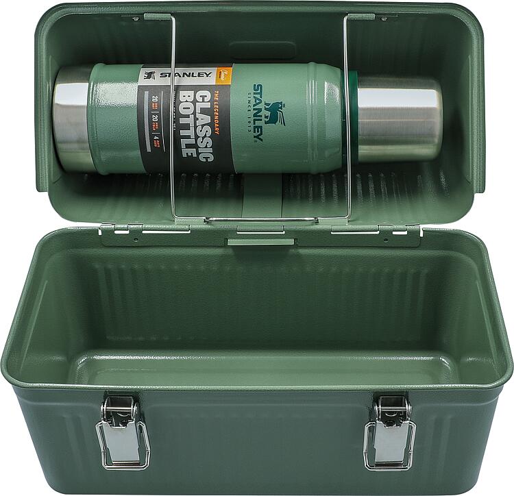 Description • Matériau : acier SPC, 0,6mm, avec peinture martelée verte • Capacité (l) : 9,4 • Poids (kg) : 1,7 • Support de bouteille dans le couvercle (livré sans bouteille) • Dimensions (L x l x H) mm : 330 x 165 x 254 • Avec deux boucles de fermeture sûres et une poignée de transport pratique Caractéristiques techniques