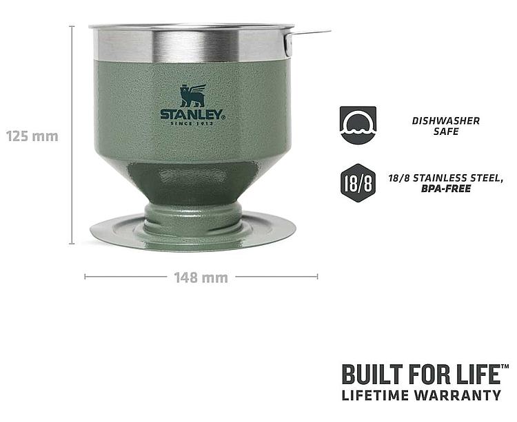 Description • Matériau : acier inox 18/8 anti-rouille avec finition martelée verte • Filtre en acier inox amovible, réutilisable • Pour 6 tasses (ml) : 236 • Contenance (ml) : 354 • Dimensions (ø x H) (mm) : 118 x 125 • Poids (g) : 200 Caractéristiques techniques