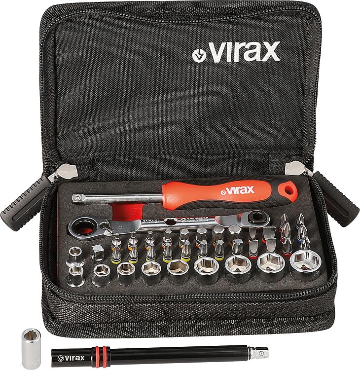Description Contenu : • Clé à cliquet multifonctions 1/4" pour clés à pipe et embouts • Rallonge magnétique 1/4" 134 mm • Poignée enfichable carrée de 1/4 • Douilles pour cliquet : SW 5,5 / 6 / 7 / 8 / 9 / 10 / 11 / 12 / 13 / 14 • Embouts 1/4" Phillips : PH1 / PH2 / PH3 • Embouts 1/4" Pozidriv : PZ1 / PZ2 / PZ3 • Embouts 1/4" fente : 3,5 / 4,5 / 6,5 / 8 mm • Embouts 1/4" à six pans creux : SW 2 / 2,5 / 3 / 4 / 5 / 6 / 7 / 8 • Embouts 1/4" Torx : TX9 / 10 / 15 / 20 / 25 / 27 / 30 / 40 • Adaptateur d'embouts carrés 1/2" x carrés 1/4" • Boîte en tissu compacte pour un rangement facile Caractéristiques techniques