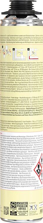 Description • Remplissage des joints de fenêtre, volets roulants, rebords de fenêtres, cavités de construction en bois et combles • Classe de matériau B2 • Rendement jusqu'à 48 litres • Mousse de polyuréthane mono-composant • Utilisable toute l'année • Très haute élasticité • Très bonnes caractéristiques d’isolation thermique et phonique • Découpable au bout d'env. 30 min • Ne colle plus après env. 10 min • Durcissement total après env. 24 h • Température de traitement -10 °C à +35 °C • Capacité de stockage jusqu'à 15 mois • Contenance : 750 ml Utilisation : • Béton • Surfaces anodisées • Placoplatre • Bois • Brique silico-calcaire • Plastiques • Maçonnerie • Métaux • Enduit • Pierre Caractéristiques techniques