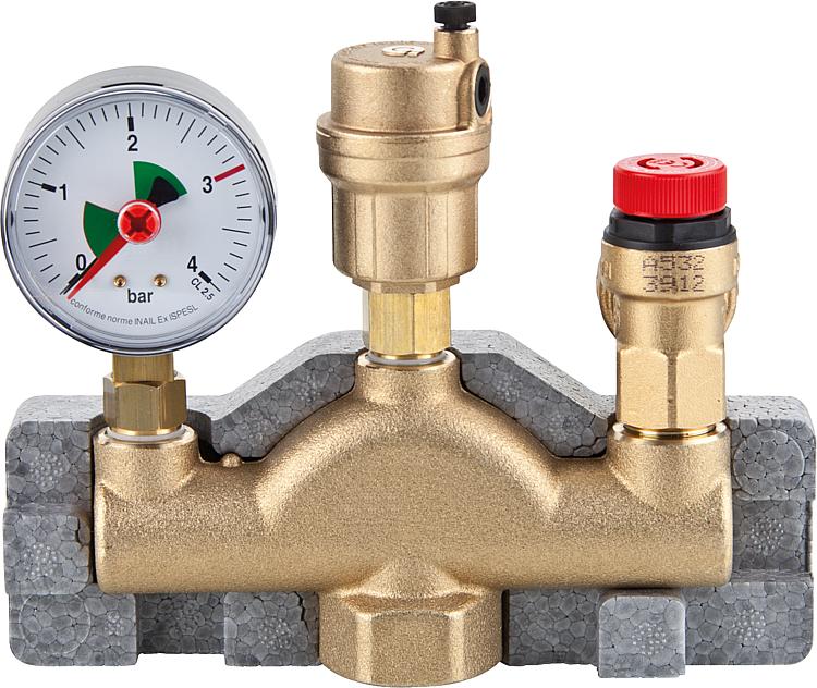 Description • Branchement: DN25 (1“) femelle • Matériau : laiton • Groupe prémonté avec soupape de sécurité (3 bar) • Manomètre (4 bar) et purgeur automatique • Température de service: max. 110°C • Dimensions (l x h x P) : 185 x 160 x 65 mm Caractéristiques techniques