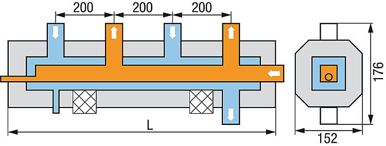 Description • Débit eau chaude : jusqu'à 5,3 m³/h • Puissance ∆t=20°C jusqu'à 120 kW • Chambre aller se trouve dans la chambre de retour • Raccords chaudières inférieure DN40 (1½" femelle) manchon, raccord aller latéral, raccord retour inférieur • Raccords groupe : DN32 (1¼" femelle) manchon • Manchon de vidange DN15 (½") femelle pour chambre aller et retour • Isolation (35 mm) avec revêtement en tôle d'acier zingué (0,6 mm) • Construction compacte avec aller et retour intégrés • Sortie groupée juxtaposée. • Testé sous pression et zingué • Pression de fonctionnement max. 6 bars • Température de départ max. 90°C • Inscription du départ et retour dans le manteau en tôle d'acier. Chercher dans le catalogue