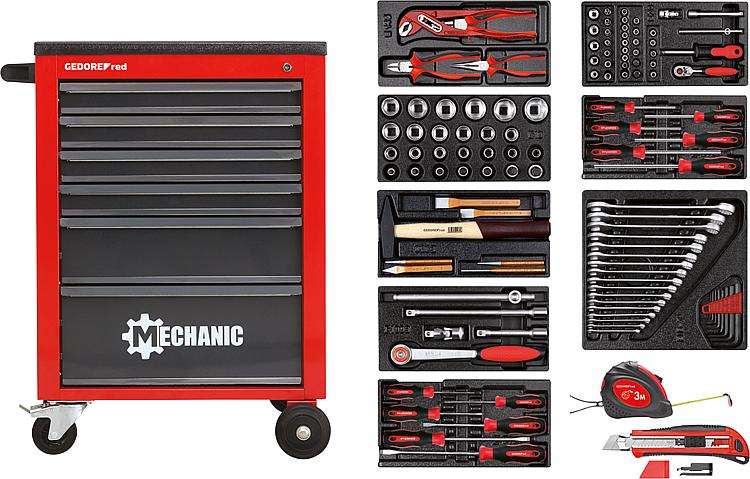 Description • Verrouillage centralisé avec serrure cylindrique et 4 clés • 6 tiroirs avec rails télescopiques et verrouillage individuel • Charge admissible par tiroir 25 kg • Dimensions intérieures tiroir (mm): 482 x 345 • Hauteur tiroir (mm): 4 x 69, 1 x 144, 1 x 218 • 4 roues : - 2 roues pivotantes ø 100 mm, dont une avec frein à double blocage - 2 roues fixes ø 140 mmmm • Charge (kg): 210 • Dimensions (mm): 903 x 625 x 510 • Poids (kg): 70 Avec équipement, composé de : • Cliquet réversible 12,7 mm (1/2“) avec accessoires : - Cliquet réversible denture fine, 72 dents, 250 mm - Rallonges 125, 250 mm - Poignée transversale avec pièce coulissante 250 mm - Joint de cardan 66 mm • Douilles 12,7 mm (1/2“): - Douilles 6 pans: 10 / 11 / 12 / 13 / 14 / 15 / 16 / 17 / 18 / 19 / 21 / 22 / 23 / 24 / 26 / 27 / 28 / 30 / 32 mm - Douilles cliquet 6 pans creux : 6 / 7 / 8 / 9 / 10 / 12 / 14 mm • Kit de pinces : - Pinces multiprises - Pince combinée - Pince à bec demi-rond - Pince coupante diagonale • Douille cliquet 6,3 mm (1/4“): - Cliquet réversible denture, 72 dents, 150 mm - Poignée 4 pans 165 mm - Douilles cliquet 6 pans : 4 / 4,5 / 5 / 5,5 / 6 / 7 / 8 / 9 / 10 / 11 / 12 / 13 mm - Embouts de vissage 6 pans creux : 3 / 4 / 5 / 6 / 8 / 10 mm - Embouts de vissage fente 5,5 / 6,5 mm - Embouts de vissage cruciforme PH 1 / 2 / 3 mm - Embouts de vissage cruciforme PZ 1 / 2 mm - Embouts de vissage TORX® avec forage T10 / T15 / T20 / T25 / T27 / T30 / T40 mm - Rallonge clé à douille 100 mm - Poignée transversale avec pièce coulissante 115 mm - Joint de cardan • Kit de tournevis : - Fente 4 / 5,5 / 6,5 / 8 mm - Cruciforme PH 1 / 2 - TORX® T10 / T15 / T20 / T25 / T30 / T40 • Marteau de serrurier 300 g • Burin plat 125, 150 mm • Trépan en croix 125 mm • Pointeau 4 mm / 120 mm • Pointerolle 4 mm / 120 mm • Chasse-goupilles 3 mm / 150 mm • Jeu de clés mixtes et polygonales : 6 / 7 / 8 / 9 / 10 / 11 / 12 / 13 / 14 / 15 / 16 / 17 / 18 / 19 / 21 / 22 / 24 mm • Kit de clés mâles coudées six pans : 1,5 / 2 / 2,5 / 3 / 4 / 5 / 6 / 8 / 10 mm • Cutter avec 5 lames largeur 25 mm • Mètre à ruban 8 m Caractéristiques techniques