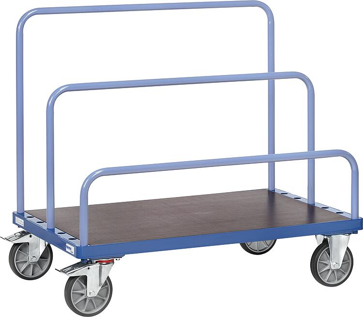 Description • Capacité de charge : 750 kg • Acier tubulaire, acier profilé, construction soudée, revêtement par poudre, RAL 5007 • Plaque de sérigraphie plateforme • 7 options de réglage pour les supports d'insertion • Support lumière de distance : 90 mm • 2 roues fixes et 2 roues pivotantes (roulettes pivotantes avec freins) EN 1757-3 • Livré sans support Caractéristiques techniques