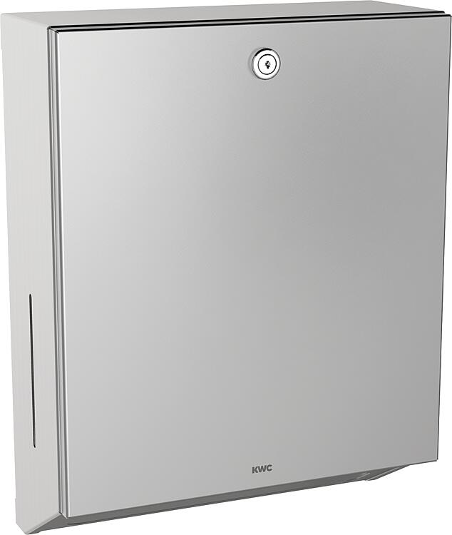 Description • Matériau : acier au nickel-chrome • Surface : Satiné mat • Dimensions (L x H x P) : 275 x 355 x 112 mm • Capacité de 300 à 400 Pièces selon la marque et le pliage. • Serrure à cylindre avec clé unique KWC • Suspendu au mur • Fixation incluse Caractéristiques techniques