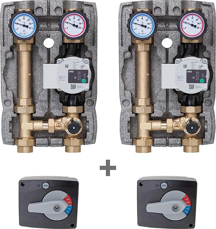 Set d'action 2x Module hydraulique Easyflow DN 25 (1") avec vanne mélangeuse à 3 voies, Wilo Para 25/6 + 2x Servomoteurs Easyflow