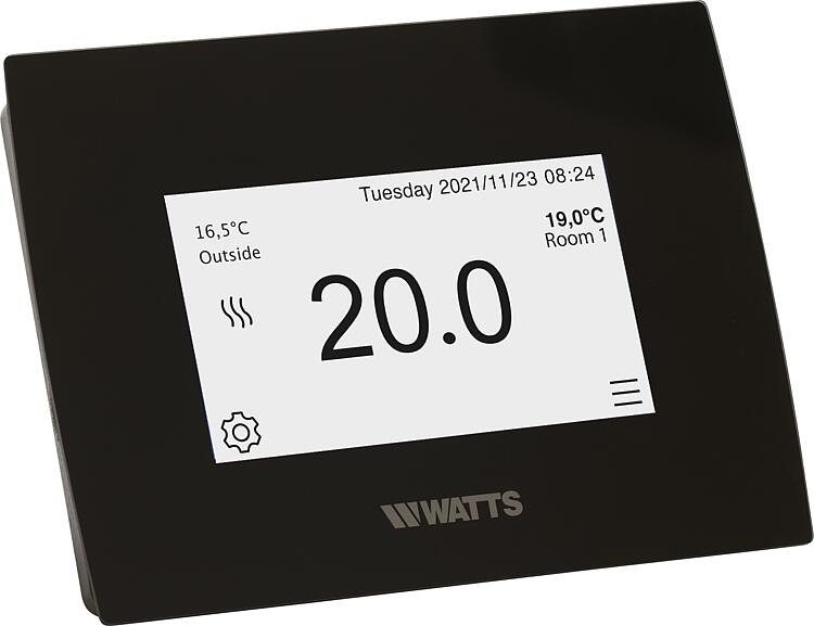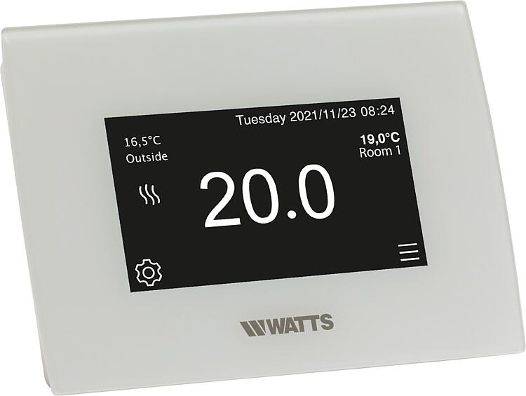 Description • Heizen/Kühlen • Front komplett aus Glas • Für die zentrale Programmierung und Steuerung des Smart Home Systems Watts Vision • 4,3-Zoll-Farbdisplay mit kapazitivem Touchscreen • Webbasierte Schnittstelle (WiFi) zur Internet Anbindung • Funk-Kommunikation mit anderen Geräten der WATTS Vision® Serie möglich • Bis zu 50 Zonen ansteuerbar (Heizen/Kühlen, Beleuchtung, Steckdosen) • Netzteil zur Nutzung der Standhalterung separat erhältlich (60 000 14) • Lieferumfang: - Bedieneinheit - Standhalterung zur Tischaufstellung Technische Daten • Betriebsspannung (Wandbefestigung / Tischständer): 230 V, 50 Hz / USB-Netzteil 5 V • Funkübertragung: 868,3 MHz • Schutzart: IP30, Schutzklasse II • Umgebungstemperatur: 0°C bis 40°C Caractéristiques techniques
