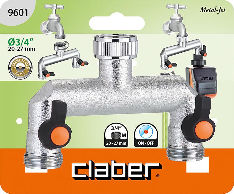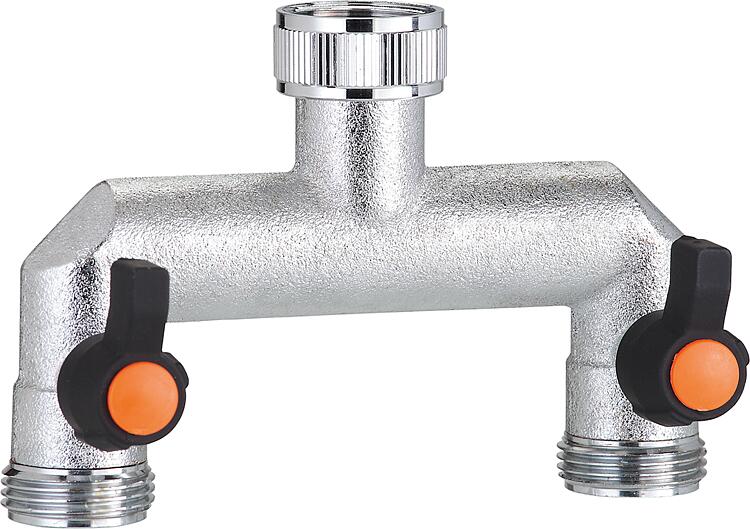 Description • Kombinierbar mit allen gängigen Stecksystemen und Schlauchtypen • Material: Messing verchromt • Anschluss: DN 20 (3/4") ÜWM x AG • Direkt auf den Wasserhahn oder in Verbindung mit Bewässerungscomputer • 2 stufenlos regulierbare Ausgänge Caractéristiques techniques