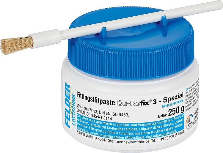 Description • Décapant pour soudure étain • Pour le brasage de tubes en cuivre • Label d'agrément DVGW : DV-0101 AT 2247 • Fraction de métal : L - Sn Cu 3 • Contenu net: 250 g • DIN EN 294531 Chercher dans le catalogue