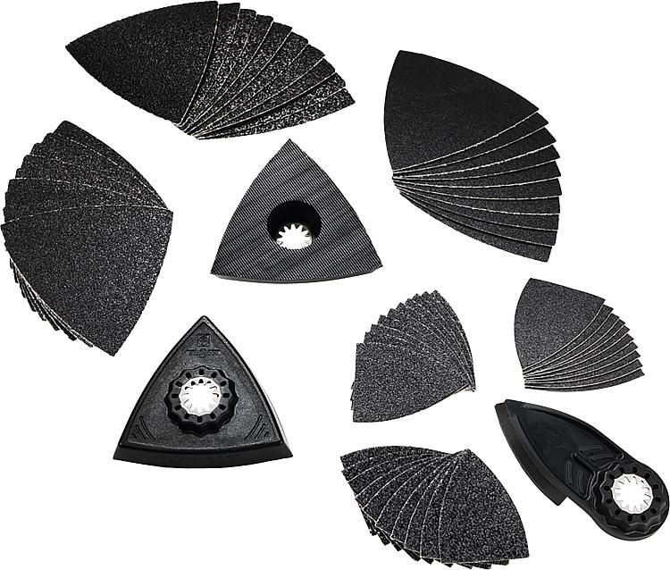 Description • logement : STARLOCK • Contenu de la livraison : - 2 x plateau de ponçage non perforé 80 mm - 1 x doigt de ponçage - 10 x feuilles abrasives pour chaque plateau de ponçage (K60, 80, 120) - 10 x feuilles abrasives pour chaque doigt de ponçage (K60, 80, 120) Caractéristiques techniques