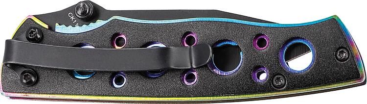 Description • Matériau de la lame : Acier 7Cr17, inoxydable • Dureté Rockwell de la lame : 52-54 HRC • Longueur de lame (mm) : 70 • Longueur de poignée (mm) : 89 • Longueur totale (mm) : 169 • Poids (g) : 63 • Lame bloquée à l’état ouvert • Commande à une main, la lame s’ouvre avec l’épingle du pouce • Poignées platines en acier inoxydable, aspect arc-en-ciel • Équipement : - Clip ceinture Caractéristiques techniques