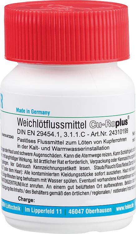 Description • Pour brasage de tubes en cuivre dans les installations d'eau chaude et froide selon DVGW feuille d'instruction GW 7 • DIN EN 29454, 3.1.1.C • Les résidus de décapant sont solubles dans l´eau froide • Certifié : DV-0101 AT 2243 • Contenu : 70 g Caractéristiques techniques