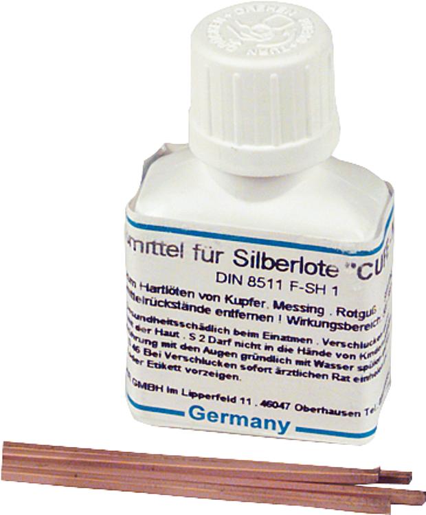 Description • pour soudure de cuivre, laiton et bronze • pour la soudure de cuivre sur cuivre, le décapant n'est pas nécessaire • 4 baguettes fil cuivre Nr. 94, L-CuP6, 94% cuivre, 6% phosphore, DIN 8513 • 1 bouteille 25 g décapant pour brasure à l'argent, pâte, DIN EN 1045 -FH 10 • température de régime 730° C Caractéristiques techniques