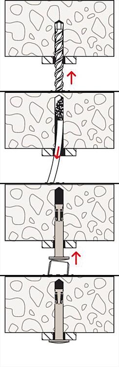 Description Description du produit • Acier galvanisé • Le goujon allie les avantages d´un principe d´expansion d´un goujon d´ancrage et un montage simple à frappe • Le couple de serrage est supprimé • Il s'expanse de façon autonome au moment de la mise en charge. Le cône est alors ramené dans la bague d'expansion, et s'expanse • Fixe des faux-plafonds suspendus, des conduites, des chemins de câbles, des revêtements muraux, Fenêtre, panneaux de protection contre les incendie, etc Homologué pour : • Le béton fissuré C12/15 jusqu´à C50/60 comme fixation (redondante) multiple de système non-porteur même en zone tendue Convient aussi pour : • Pierres naturelles à structure dense • Pierre pleine silico-calcaire • Plaques en aggloméré béton précontraint Pour fixation de : • Lattes • Profilés métalliques • Chevrons • Chaînes • Bandes peforées • Suspentes • Produits coup-feu • Gaines de ventilation • Unterkonstruktionen aus Holz und Metall • Plafonds suspendus • Colliers métalliques • Plaques de plâtre Avantages : • Très facile à installer : un perçage, un coup de marteau - c'est fait • 2-4 coups de marteau et la FNA II est installée • Utilisable également pour les fixations légères (bois, cartonplâtre,..) • La plus faible profondeur d'ancrage seulement 30 mm réduit le temps de perçage, en vous faisant gagner du temps et réduit les heurts contre l'armature. • Efforts de traction plus importants autorisés jusqu'à 2,4 kN • Distances aux bords et des entraxes très faibles pour les applications même avec des composants aux dimensions réduites (par exemple : orifices étroits de 10 cm uniquement) • Pour matériau à partir de 8 cm d'épaisseur • Aucune charge d'essai n'est plus nécessaire! • Première cheville à frapper conforme aux Agréments techniques européens dans le béton C12/15 (B15) à faible résistance • Montage pré-enfichable et enfichable • ø perçage : 6 mm • Profondeur d'ancrage min : 30 mm • ø tête : 13 mm Caractéristiques techniques