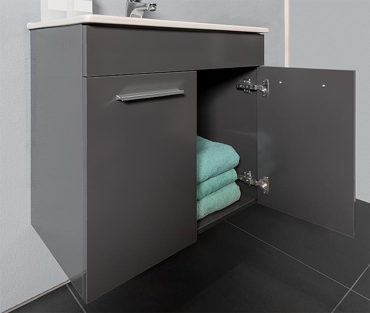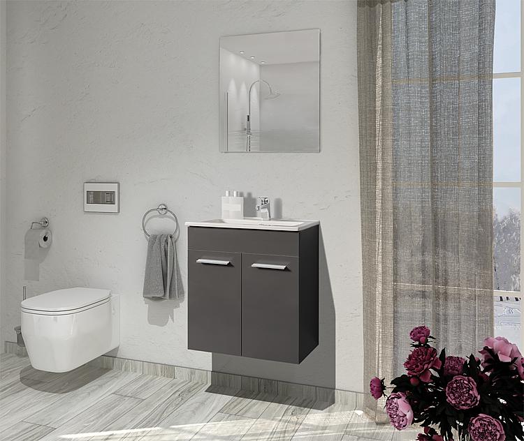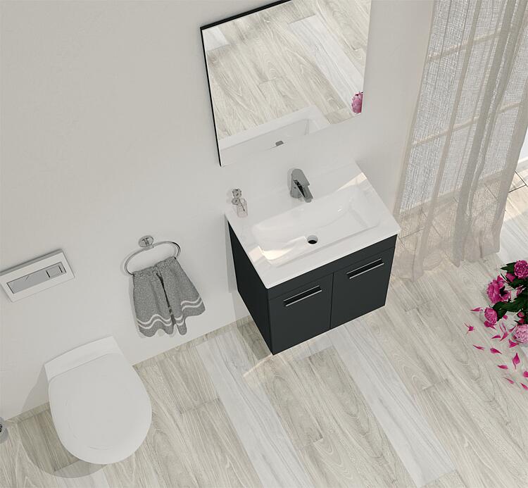 Description Meuble sous-vasque avec lavabos en Céramique. • Suspendu au mur • Matériau : - Blanc brillant : panneau de particules - Anthracite brillant : MDF • 2 portes battantes avec Softclose • 1 trou de robinetterie percé • Avec trop-plein • 1 grand compartiment de rangement • Dimensions (L x H x P) : 590 x 595 x 395 mm • Entièrement pré-monté • Siphon en plastique inclus (extensible) Miroir • Dimensions (L x H x P) : 585 x 620 x 20 mm • Fixation incluse Caractéristiques techniques
