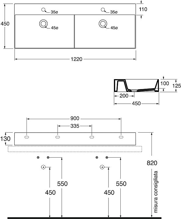 Double vasque Elayla avec trou de robinet en céramique, blanc 1220x130x450 mmN° de commande : 93 054 50 ![]()