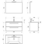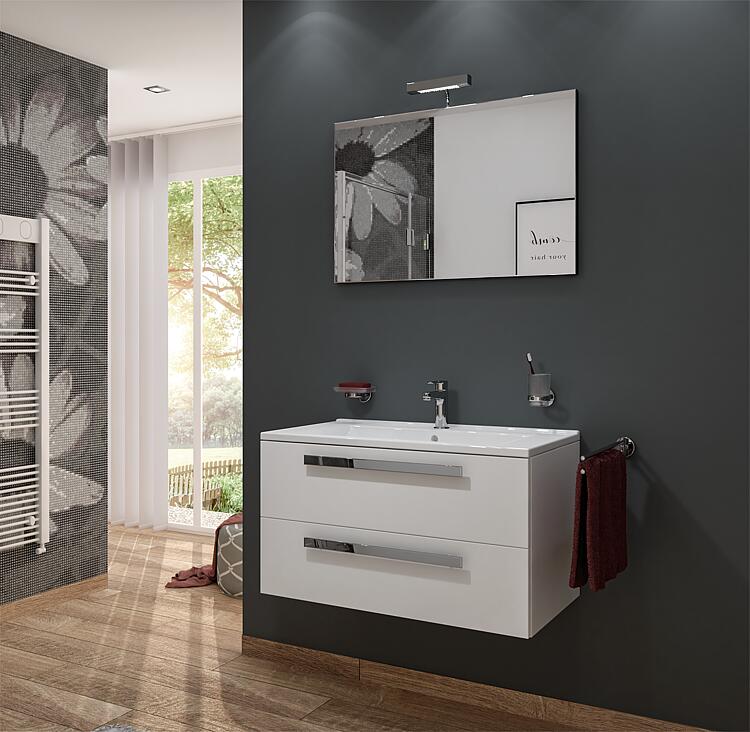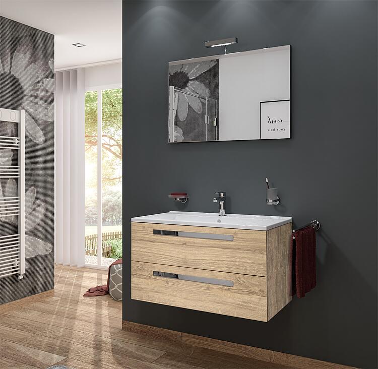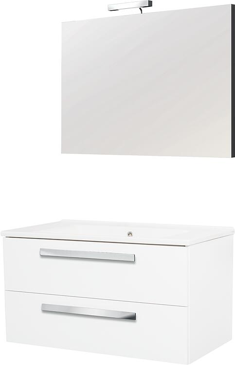 Description Meuble sous-vasque avec vasque en céramique • Suspendu • 2 Tiroirs avec softclose • 1 Trou percé pour robinetterie centrale • Dimensions (l x H x P): 853 x 466 x 455 mm Miroir avec éclairage LED • Puissance : 4,32 Watts • Classe énergétique : A++ • Tension : 230 V • Classe de protection : IP44 • Avec interrupteur à bascule • Dimensions (l x H x P): 850 x 554 x 25 mm • Fixations incluses Délai de livraison : 6-8 semaines Caractéristiques techniques