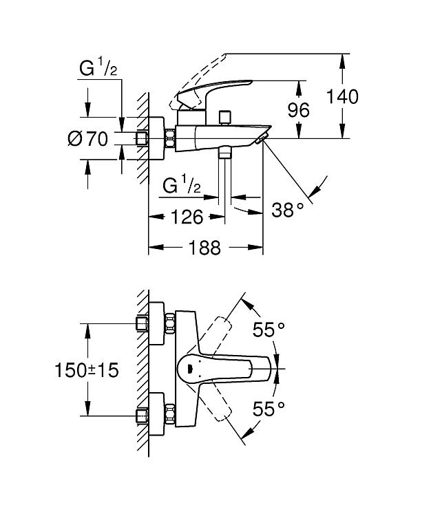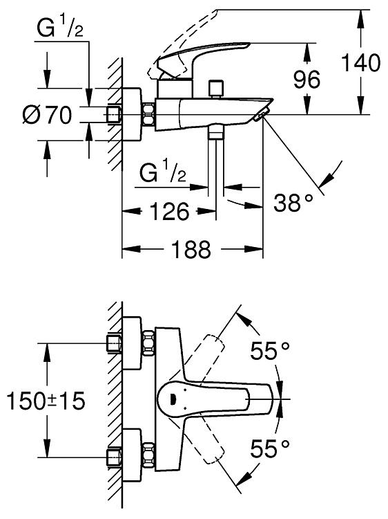 Description • Matériau : laiton • Mitigeur : monocommande • Hauteur : 96 mm • Saillie : 188 mm • Débit à 3 bar: 19 l/min • Inverseur bain/douche • Clapet anti-retour • Avec limiteur de température • GROHE SilkMove® cartouche céramique 35 mm • Limiteur de débit réglable Caractéristiques techniques