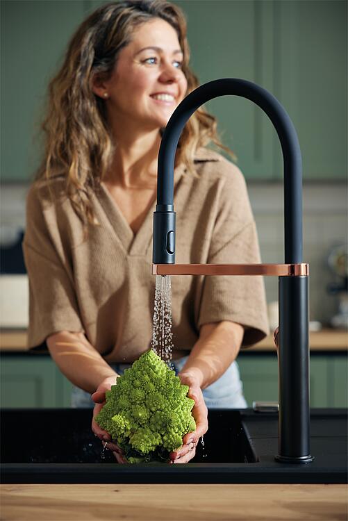 Mitigeur d'évier Wasserwerk WK 2 Saillie 210 mm Douchette amovible noir mat/or roseN° de commande : 93 269 55 ![]()