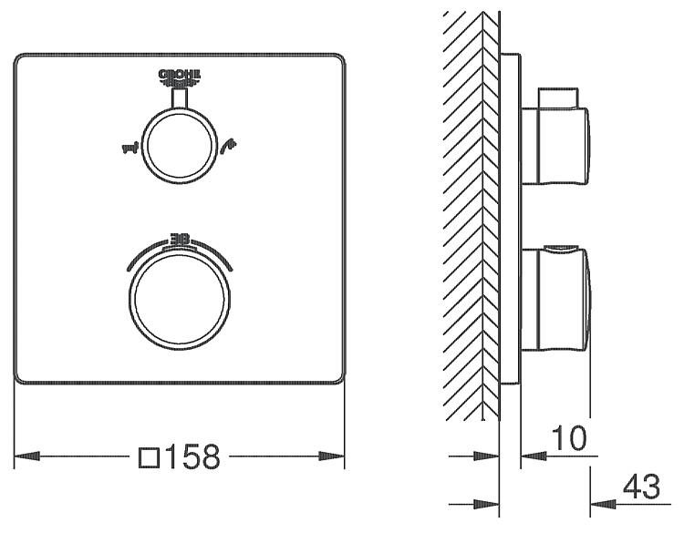 Description • Matériau : laiton • Surface : chromé • Rosace métallique : 158 x 158 mm • Arrêt et régulation du débit • Inverseurs Baignoire et Douchettes • Butée de sécurité GROHE SafeStop® à 38°C • GROHE SafeStop® butée de température en option à 43°C ou 46°C • Clapet anti-retour et tamis de récupération des impuretés intégrés • Corps de base nécessaire Référence : 93 054 95 (Réf. fabricant 35600000) Caractéristiques techniques