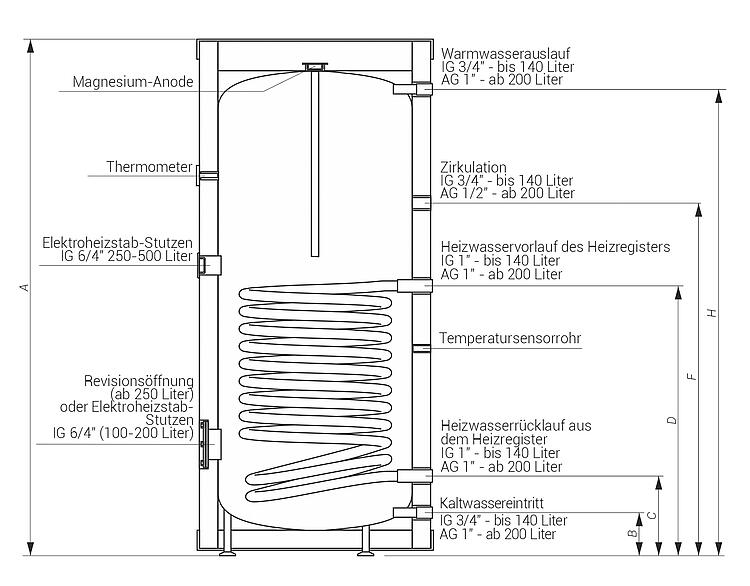 Description • Réservoir : acier, émaillé (technique innovante d'émaillage humide) • Échangeurs thermiques à tube lisse • Anodes de magnésium pour la protection anticorrosion • Pieds réglables en hauteur • Thermomètre analogique • Bride de révision à partir de SW-251 • Manchons supplémentaires pour résistance électrique DN 40 (1 1/2") • Isolation : - SW 120-140 : 53 mm de PUR - SW 201-501 : 67 mm PUR • Couleur de la gaine : blanc • Pression de service Ballons eau chaude sanitaire : max. 6 bar • Pression de service Échangeurs thermiques : max. 10 bar • Températures de service : max. 95°C EEK = classe d´efficacité énergétique (selon la directive ErP) Caractéristiques techniques