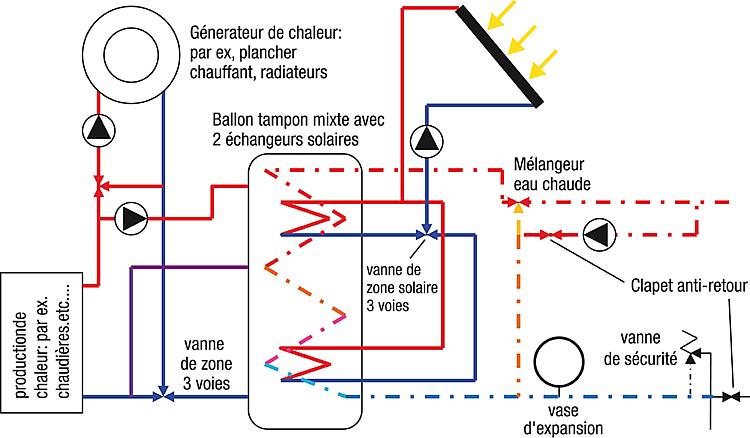disponibilité immédiate Description • Capteur plat type SX 2,51 (2,51 m²), dimensions (L x l) : 2240 x 1120 mm • Station de pompage entièrement montée avec : - 1 x pompe, Wilo Para ST 25/6 PWM - 1 x Débitmètre 2 à 12 Ltr./min. - 1 x indicateur de température dans l'aller et le retour - 1 x Robinets à boisseau sphérique avec clapet anti-thermosiphon, à poser sur le départ et le retour. - 1 x robinet de vidange KFE dans le retour - 1 x Manomètres 10 bar - 1 x Soupape de sécurité à membrane 6 bar • 1 x Kit de raccords avec pièce en T croisée, coude, raccord KL pour Tube Cu ø 22 mm et 2 x Flexibles de raccordement 1 m pour l'introduction dans le toit • 1 x Régulations solaires DeltaSol BX, y compris 5 sondes pour la charge solaire et le chauffage d'appoint en liaison avec la vanne de commutation à trois voies. • 1 x mélangeur d'eau sanitaire DN 20 (3/4"), plage de réglage 30 à 65°C • 1 x vanne d'inversion à trois voies DN 25 (1") pour le soutien au chauffage • 1 x Kit de fixations murales et de tuyau ondulé pour vase d'expansion (y compris raccord d'arrêt ; supprimé pour la référence : 97 031 19) • Kit de montage sur toit uni en inox/alu pour tuiles de toit normal jusqu'à 380 mm : par exemple Frankfurter Pfanne • 1 x vanne d'inversion trois voies Solaire pour les installations avec accumulateur hygiénique avec 2 échangeurs thermiques • Pour la référence : 97 031 19 Vases d'expansion 50 Ltr. et Vannes d'arrêt • Capteur Identification : Fabricant : SUNEX S.A. Type : SX 2,51 No. d'enregistrement : 011-7S140 F • Convient pour env. 4 personnes et pour une surface max. de 130 m² • 4 x capteurs solaires type SX 2,51 (2,51 m²) • 1 x vase d´expansion 25 l • 2 x fluides caloporteurs 10 kg (à mélanger) Ballon 800 l (PCS/MX1W/MX2W) • ø avec isolation : 1050 mm • ø sans isolation : 790 mm • Hauteur totale : 1735 mm • Mesures de basculement : 1830 mm • Classe énergétique : C La composition des kits solaires représente un système de base totalement modifiable. Il est indispensable de faire vérifier, compléter ou adapter votre installation par un professionnel selon le type d´habitation, la localisation géographique ou le nombre de personnes. Des questions sur cet article ?Connectez-vous d'abord Ajouter à une listeConnectez-vous d'abord |