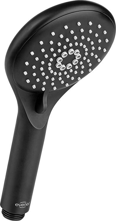 Description • Matériau : plastique ABS • Couleur : noir mat • 3 types de jets : : WideRain, Massage, Combiné • ø 100 mm • Avec picots anticalcaires (Easy Clean) • Débit à 3 bar : 9,3l/min Caractéristiques techniques